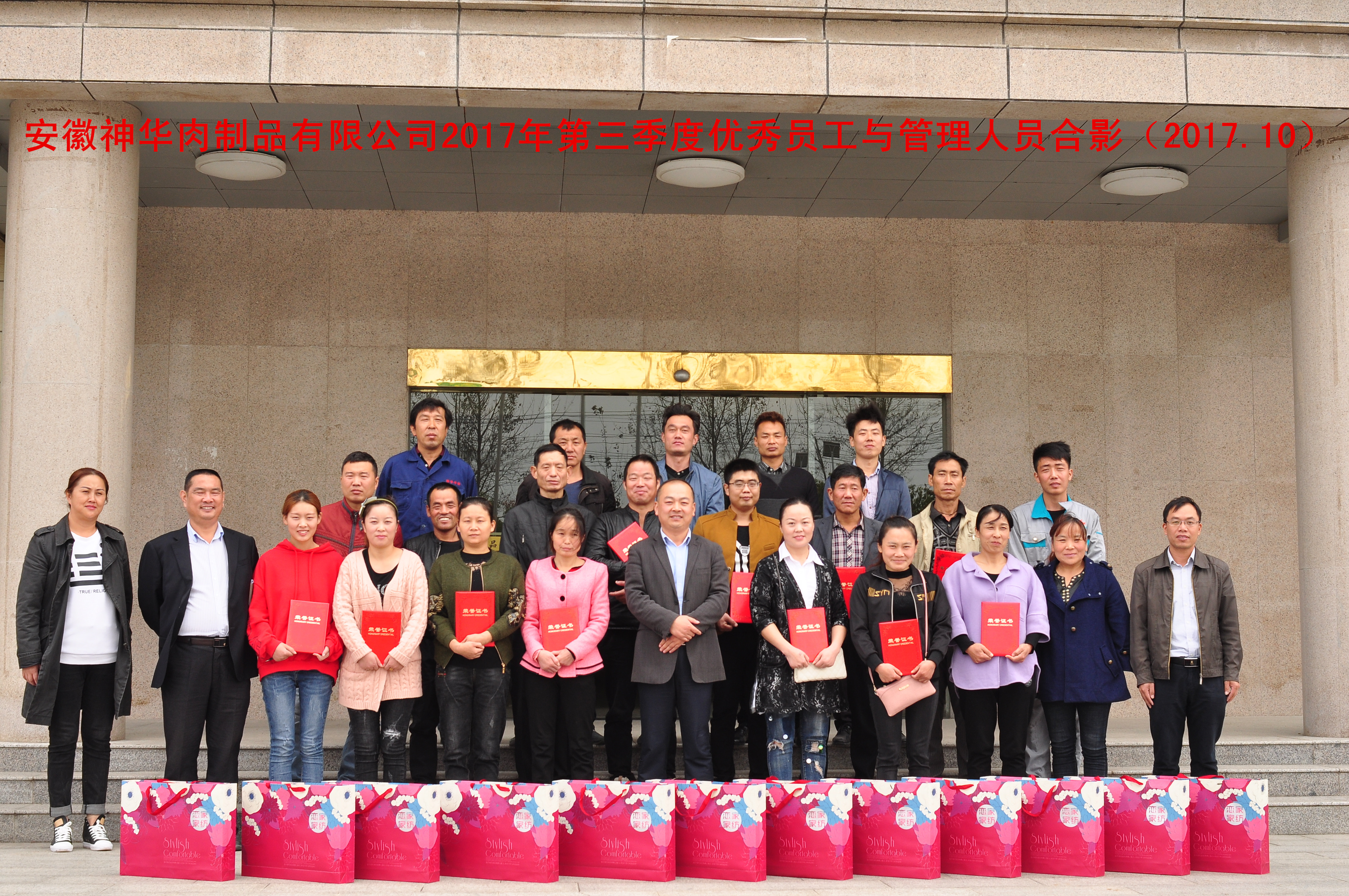 10月14日上午,安徽神华肉制品有限公司2017年第三季度优秀员工表彰大会在二楼会议室隆重举行。会议总结第三季度工作成绩,表彰在第三季度工作中做出突出贡献的先进个人,展示向上争优正能量,进一步增强公司凝聚力,激发全体员工的工作热情。